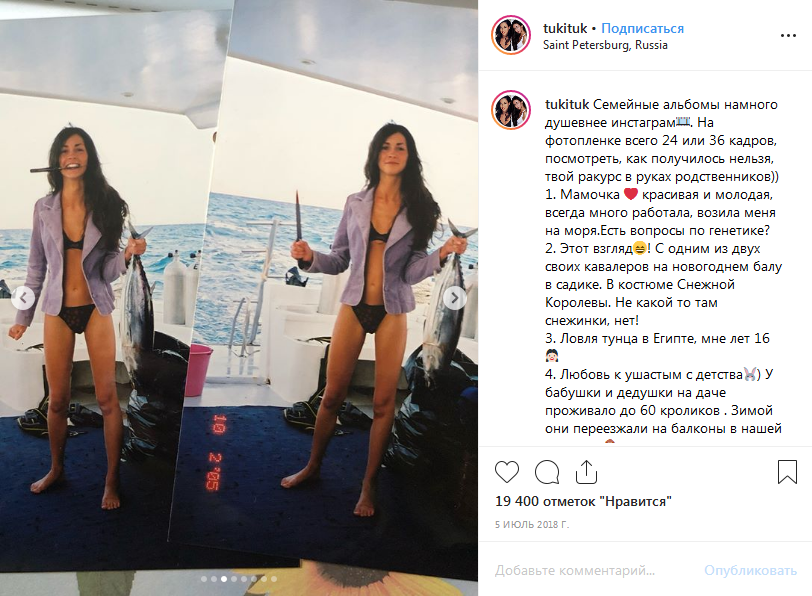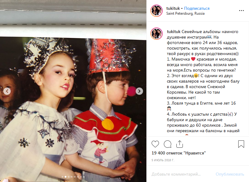 Родилась Настя Тукитук в Санкт-Петербурге, и про себя она сейчас говорит: «Я – из Петербургской интеллигенции!» Мама девушки до сих пор живет в северной столице, с ней и своей младшей сестрой Настя обожает выкладывать свежие фото в Инстаграм. История рождения девочки, в будущем известной блогерши «Настя Тукитук», одновременно романтичная и обыкновенная для начала 90-х в нашей стране.