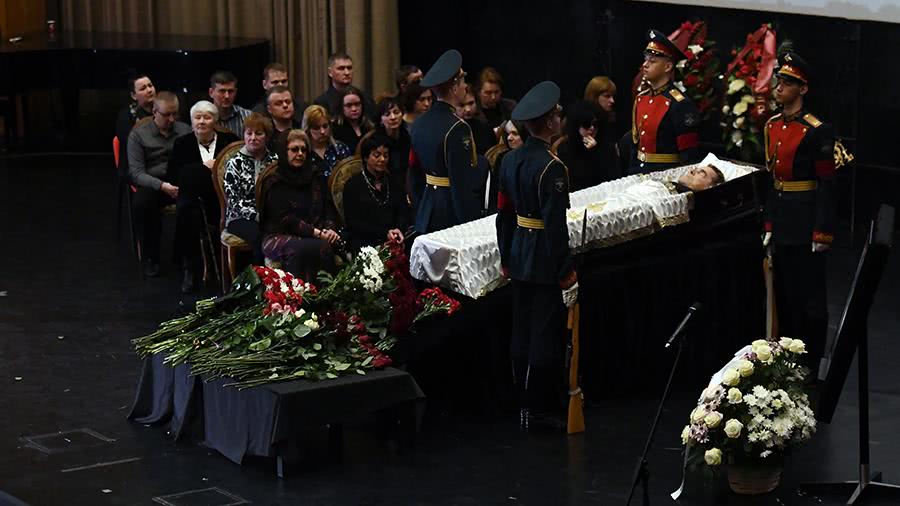 Гроб расположили посреди Большого зала Дома кино. Непосредственно на его сцене. На экране транслировали отрывки из его фильмографии, показывали фотографии с ним. В зале звучала песенная музыка в исполнении самого актера. Почетный караул состоял из курсантов военных училищ. Все утопало в цветах, на похоронах было сказано много теплых слов об ушедшем деятеле театра и кино.
