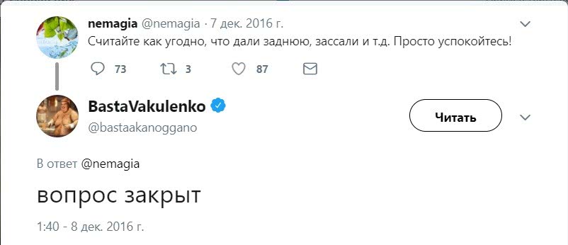 После чего видеоблоггеры из Немагии начали нелицеприятно высмеивать мать Басты в своих следующих видео. Далее последовал ролик о Басте, в котором его мать сравнили с порноактрисой. На что Василий в твиттере пообещал найти и побеседовать с матерями юмористов. Музыкант потребовал публичных извинений перед матерью, которая очень расстроилась просмотрев их ролик. Также Баста решил устроить конкурс, опубликовав твит с призывом встретить блоггеров из “Немагии” и создать «экстремальное фото или видео с ними». Далее конечно же Василий объявил этот твит розыгрышем и выложил фото жены одного из юмористов из Немагии, назвав эту фотографию “победителем”.