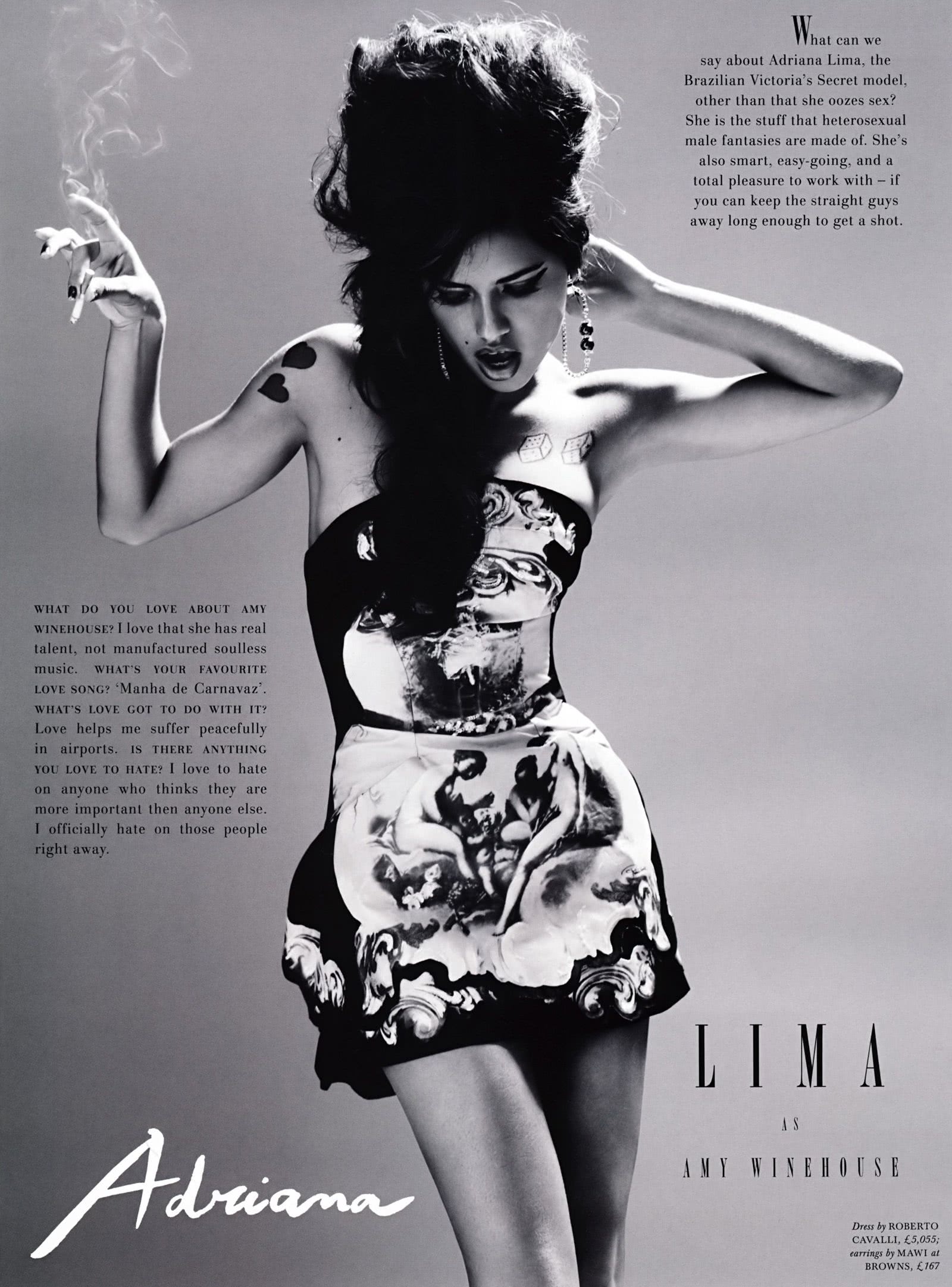 Прилизанный начес и аккуратная подводка не шли ни в какое сравнение со стилем Уайнхаус — ее стрелки всегда были размашистыми, а прическа растрепанной. Намного лучше передать образ Эми получилось у Адрианы Лимы в фотосессии для журнала Love — ретронеопрятность певицы была видна во всем, вплоть до разрозненных переводных татуировок.