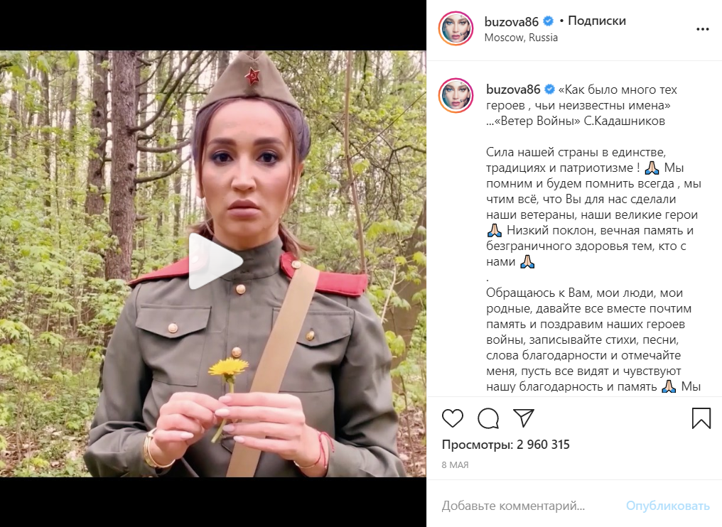 А иногда и обычный пост становится инфоповодом. 9 мая Ольгу затравили за фотосессию и видео в военной форме. Сейчас это один из самых популярных постов в её профиле