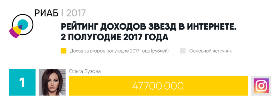 По данным РИАБ, за год Ольга получает около 100 миллионов рублей лишь с одного Инстаграма. Это данные 2017 года (последние от РИАБ, которые мне удалось найти), но сейчас доход Бузовой уж точно не уменьшился.