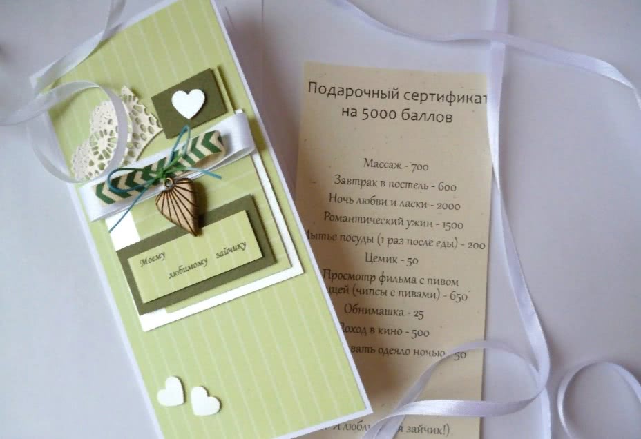 Сертификат. Это довольно непростой сертификат. Он распространяется на весьма необычные услуги: массаж, стриптиз, мытье посуды, поцелуй и т.д. Номинал выражается в баллах, каждая услуга стоит определенное количество баллов. Действует до полного использования заявленного номинала;