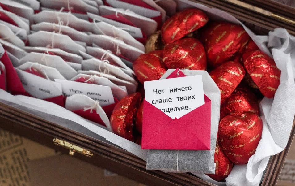 100 причин. Записки. В красивую жестяную или стеклянную банку складываются скрученные записки. Желательно, чтобы это была красивая бумага одного цвета, например, красного. Еще лучше будет, если каждая бумажка будет свернута в форме свитка, конверта, треугольника. На вкладышах можно писать признания в любви, поздравления, пожелания, план на будущую жизнь;