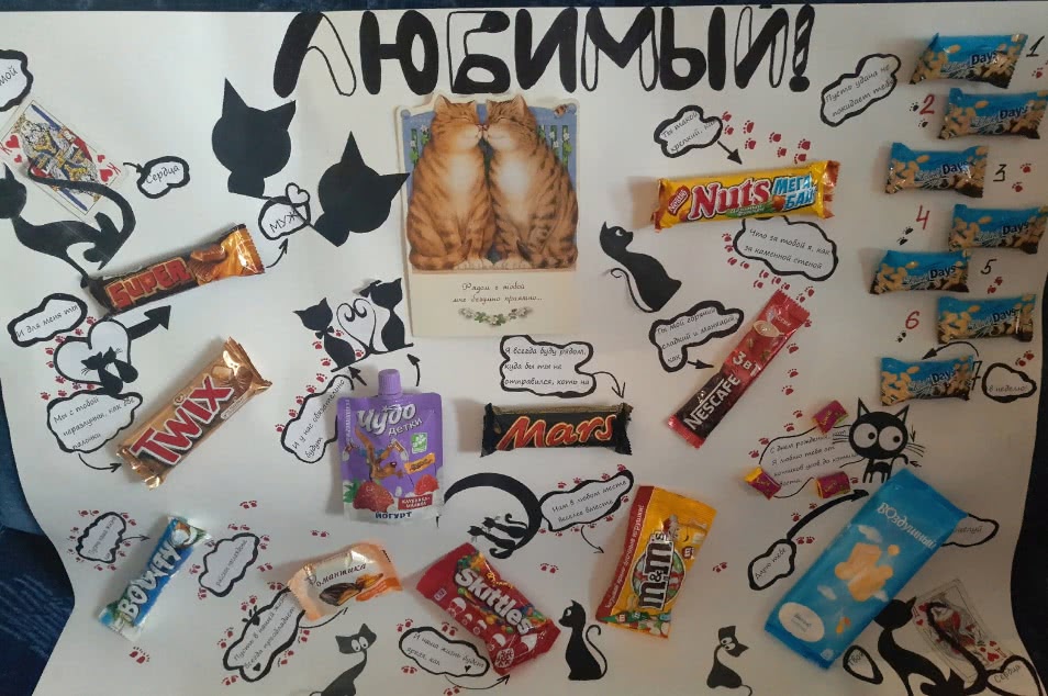 Плакат. Соберите плакат из сладостей и пожеланий, собственных рисунков и дополнительных картинок. Фантазируйте в свое удовольствие. Вспомните ласковое прозвище своего любимого, возможно, в магазине продается что-то из этой серии, а, если для вас он просто «любимый», то в магазине всегда продается коробочка с соком одноименного содержания.