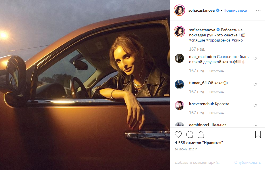 София постоянно радует своих поклонников фотографиями с профессиональных съемок. У актрисы есть свой аккаунт в Инстаграм.