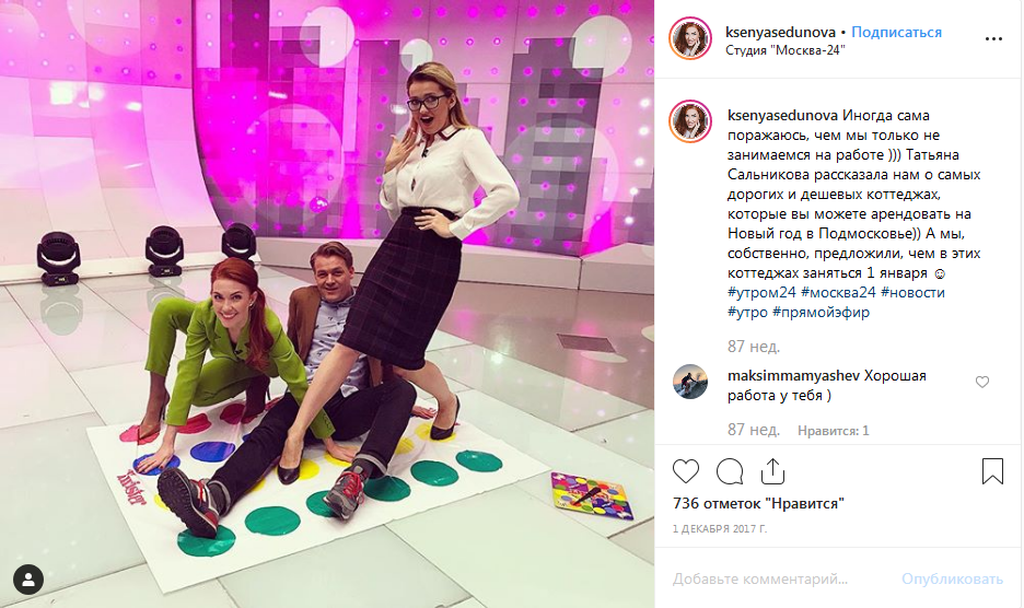 Сейчас она появляется в эфире новостей, рассказывая зрителям о событиях в нашей стране и в мире. Ксения находит время, чтобы поучиться тонкостям своей работы у своих старших коллег. Недавно она пообщалась с легендарной телеведущей Анной Шатиловой, которая покорила ее своими знаниями, умением держаться, а также моложавым видом и элегантным стилем. Седунова всегда старается посещать мастер-классы успешных людей, среди которых она отмечает Тину Канделаки. Эта харизматичная и уверенная ведущая покорила ее историями из своей карьеры и дала ответы на многие вопросы.