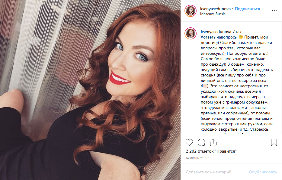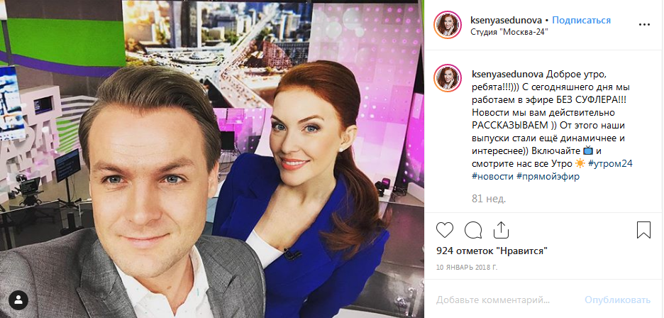 Сейчас она появляется в эфире новостей, рассказывая зрителям о событиях в нашей стране и в мире. Ксения находит время, чтобы поучиться тонкостям своей работы у своих старших коллег. Недавно она пообщалась с легендарной телеведущей Анной Шатиловой, которая покорила ее своими знаниями, умением держаться, а также моложавым видом и элегантным стилем. Седунова всегда старается посещать мастер-классы успешных людей, среди которых она отмечает Тину Канделаки. Эта харизматичная и уверенная ведущая покорила ее историями из своей карьеры и дала ответы на многие вопросы.