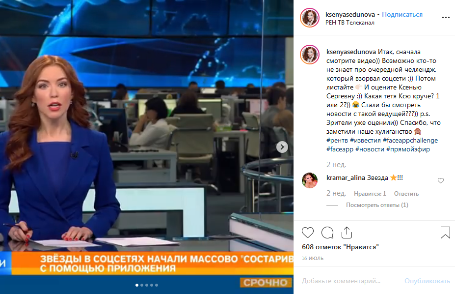 Через несколько лет Ксении поступило предложение от телеканала «Рен-ТВ» и она не смогла отказаться. Седунова отличается креативностью, талантом и современным стилем. У нее обворожительный и сильный голос, харизма и искренняя преданность своему делу. Помимо освещения новостей и событий в прямом эфире, девушка часто ведет всевозможные мероприятия.