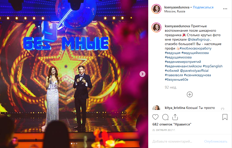 Ксения Седунова выступает модератором на конференциях и встречах по бизнесу. На международных форумах берет интервью, где ей помогает знание английского языка. Кроме серьезных событий, Ксения ведет и развлекательные мероприятия. Это могут быть юбилеи или свадьбы. Молодожены, именинники и их гости всегда остаются довольны профессиональной ведущей.