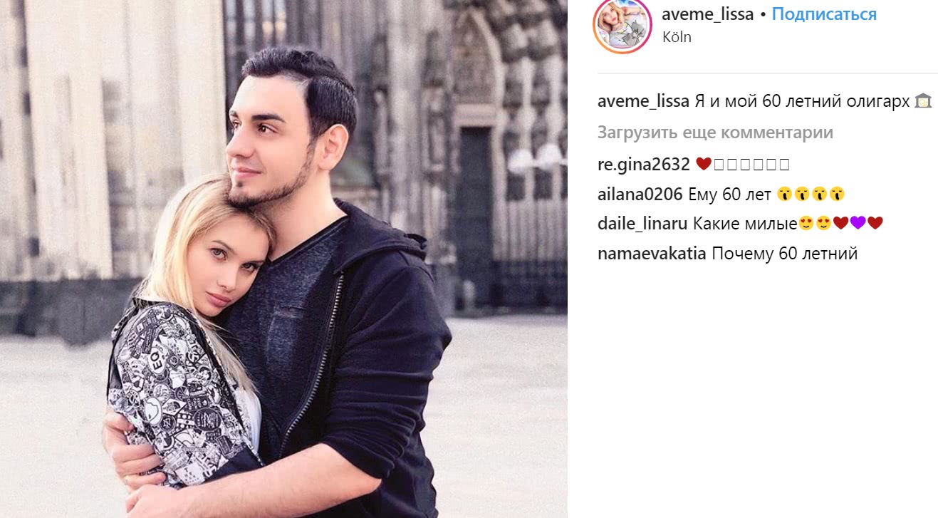 Некоторые зрители приписали ей роман и замужество за влиятельным олигархом в преклонном возрасте. Подобный факт удивил девушку, поэтому она решает поддержать подобные слухи. В итоге, все встало на свои места, на своей страничке в инстаграме звезда интернета опубликовала совместную фотографию, на которой запечатлен ее возлюбленный. Подпись к снимку была такая – «Я и мой 60-летний олигарх». На самом деле, на фото был молодой человек приятной внешности, который выглядел гораздо моложе 20 лет.