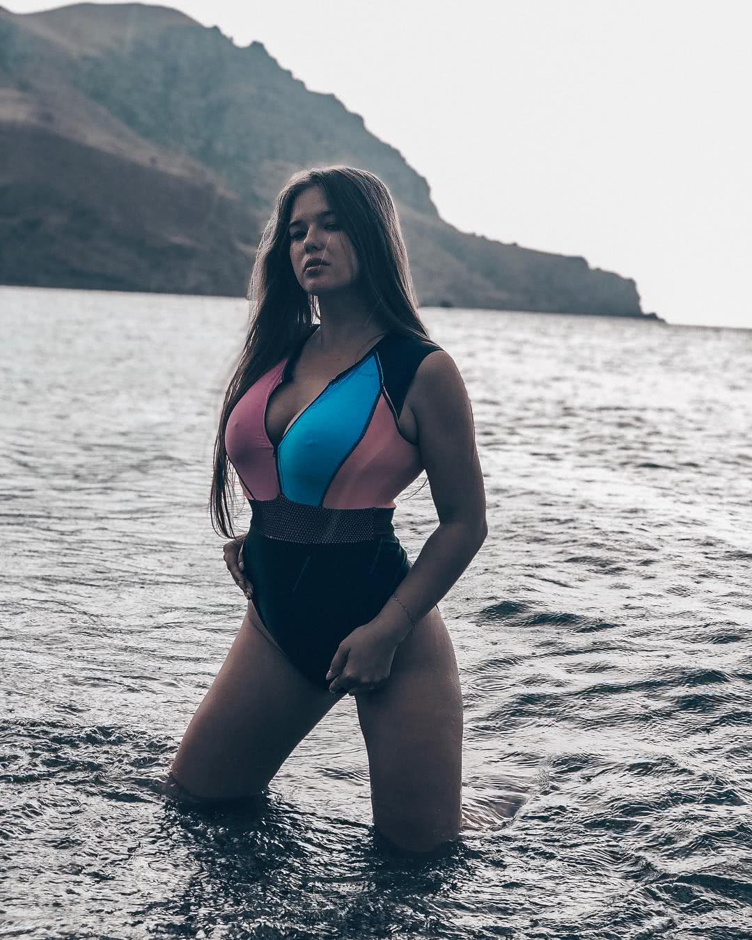 Горячая голая Мила Сайфутдинова в воде и её грудь в купальнике с большим вырезом.