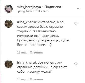 Если говорить о Бережной, то она скорее всего делала ринопластику, увеличивала губы и грудь. У Лизы очень тонкая талия и слишком большие ягодицы.