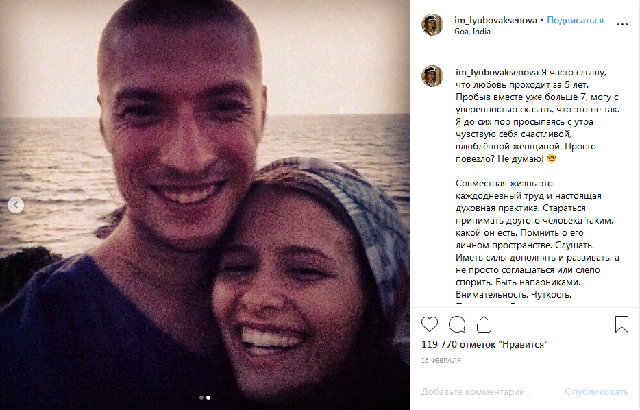 Любовь не скрывает от своих поклонников секреты счастливого брака, выкладывая на своей странице в Instagram рассуждения на эту тему. Она часто слышала, что любовь между супругами остывает примерно за пять лет, но прожив вместе с Павлом вот уже более семи лет, она может с уверенностью сказать, что это не так. Она до сих пор чувствует себя счастливой и влюблённой, да и муж часто говорит ей слова любви.