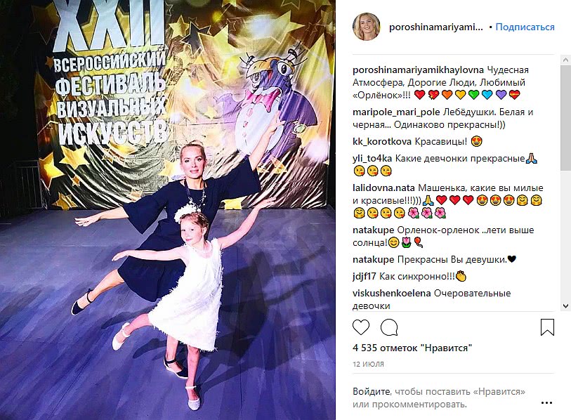 Девочка мечтает петь в оперетте. Ребенок активный, целеустремленный и добрый. Мария Порошина гордится дочкой и наслаждается ее пением.