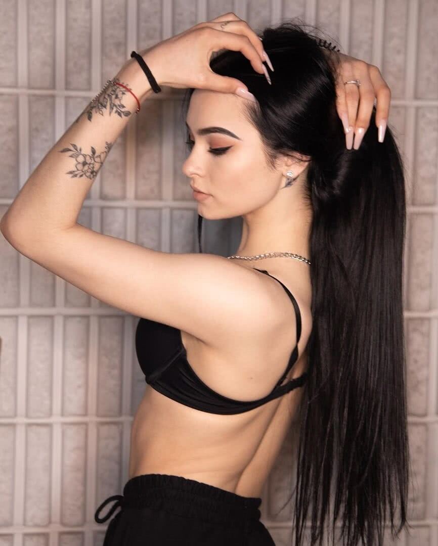 Настоящая звезда из глубинки обладает знойной внешностью – черные волосы всегда с идеальной укладкой, стройное тело и модельное лицо. Девушка самостоятельно делает макияж на уровне профи – подводит стрелки так, что ее миндалевидные глаза становятся еще более выразительными. Сюда добавляются графические скулы и сексуальный взгляд. Образ завершается симпатичными тату на руках в виде цветочного орнамента.