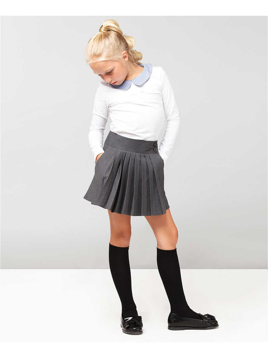 Серая юбка для школьниц занимает второе место в рейтинге популярности у родителей и их учениц. Этот цвет приятный и спокойный. Отлично подходит к белой, голубой или розовой блузке. Модницы ценят этот прекрасный вариант.