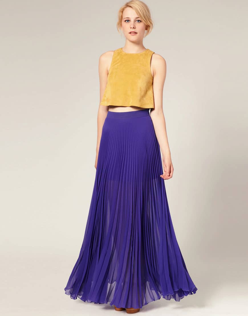 Расклешенные, в складку, а тем более пышные модели будут смотреться наиболее выигрышно в сочетании с укороченными облегающими топами. Так вы не только подчеркнете стройность силуэта и сохраните нужные пропорции, но и поддержите саму идею фасона. Для таких моделей, дизайнеры советуют достраивать образ, не увлекаясь дополнительными эффектами.