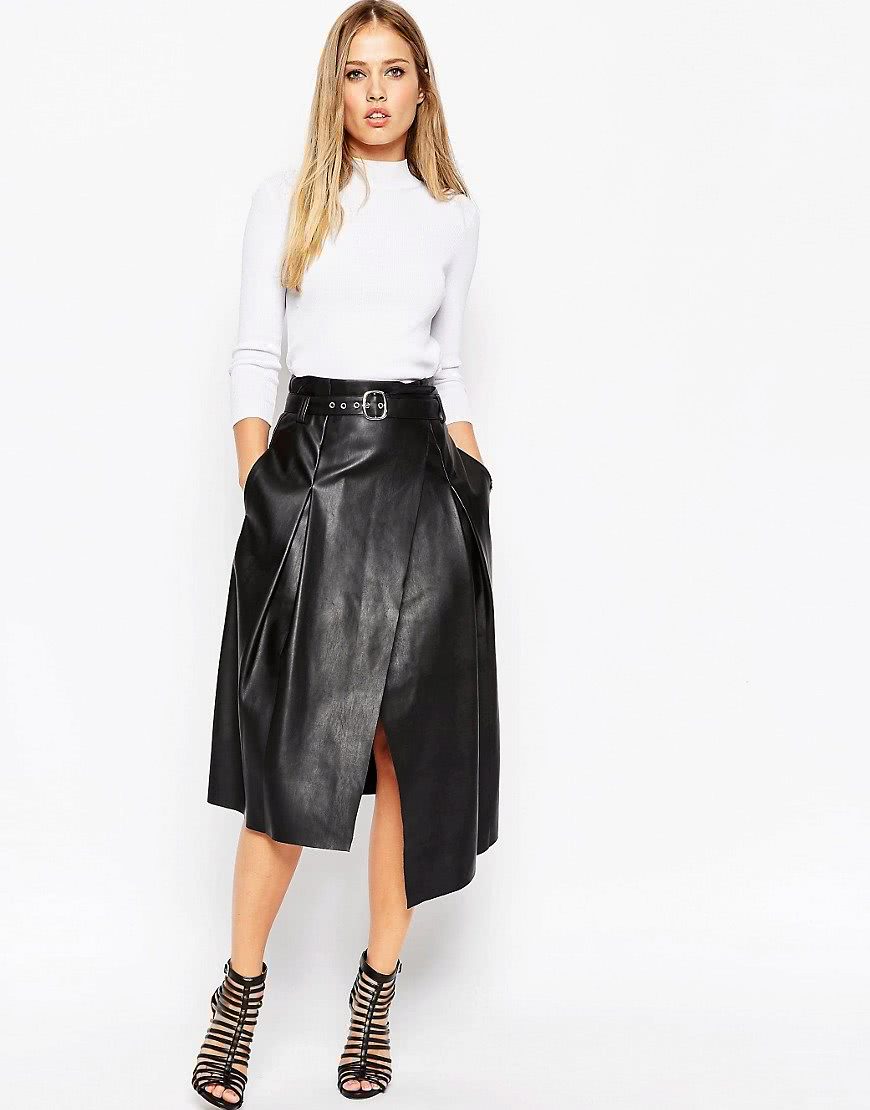 Кожаная одежда всегда смотрится эффектно, а кожаная мини-юбка точно заставит вас оказаться в центре всеобщего внимания. Чтобы выглядеть притягательно, но не вызывающе, юбку из кожи нужно сочетать с более сдержанным верхом. Намного спокойнее и нежнее смотрятся кожаные вещи светлых оттенков. Поэтому присмотритесь к коротким юбкам из белой или бежевой кожи.