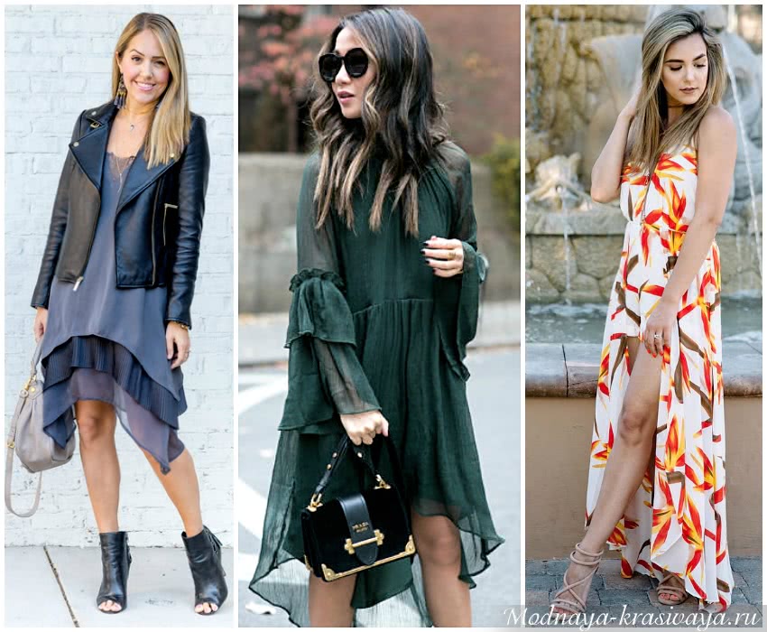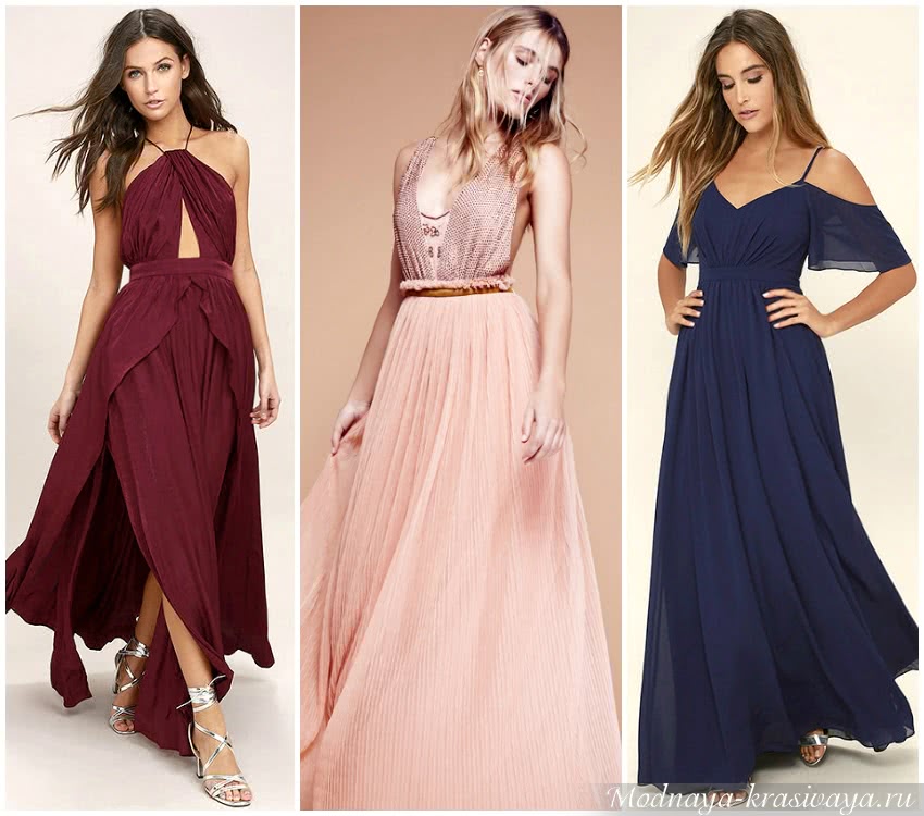 Вечерние платья могут полностью открывать плечи и зону декольте. Длина зависит от формы ног, и желательно встать на каблук.