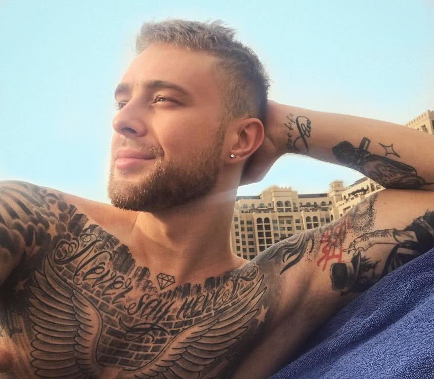 Грудь, руки и шея артиста украшены различными татуировками. Огромные крылья на фоне кирпичной стены, музыкальные ноты, изображение Майкла Джексона, сова с микрофоном, надписи «Never say never» и «Спаси и Сохрани» являются неотъемлемой частью личности певца.