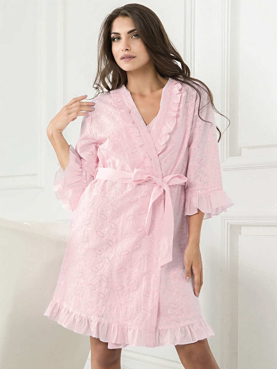 - Розовый — оттенок нежности и уюта. Такие пеньюары хорошо подходят для сна и утренних процедур. Это касается и моделей с цветами.