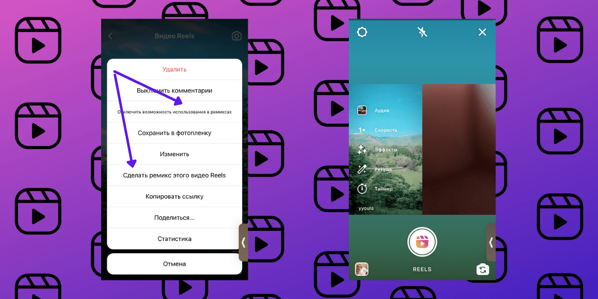 Функция «Ремикс» позволяет создать видео Reels, состоящее из двух роликов разных пользователей.