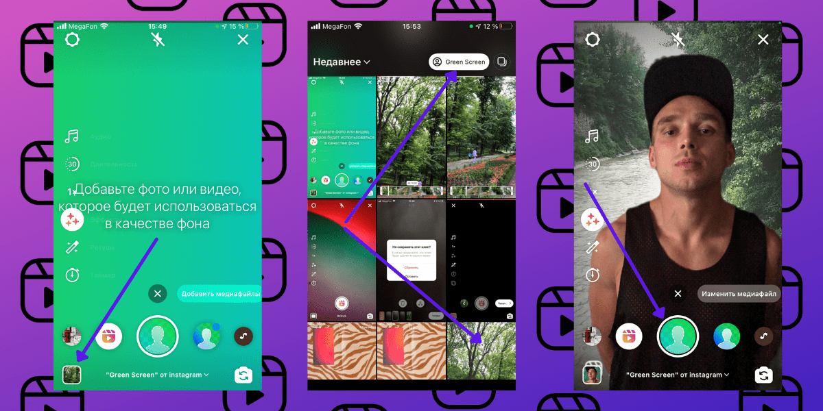 Доступна вся база AR-эффектов и масок. Отдельно вынесен режим ретуширования (по умолчанию стоит на 50 %). При съемке Reels можно использовать функцию Green Screen от Инстаграма – для этого нажмите одноименную кнопку и выберите фото или видео, чтобы установить его фоном для съемки.