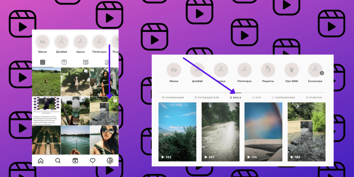 При публикации Reels можно разместить и в основной ленте вашего профиля – по аналогии с IGTV. Среди других форматов такой пост будет выделен логотипом раздела. При выборе такого поста можно нажать на логотип и перейти к просмотру не в ленте, а непосредственно в самом разделе Reels. А вот в веб-версии Инстаграма пока просмотр Reels доступен только на страницах пользователей, нет общей кнопки раздела, как в мобильном приложении, или выделенного места, как у Историй.