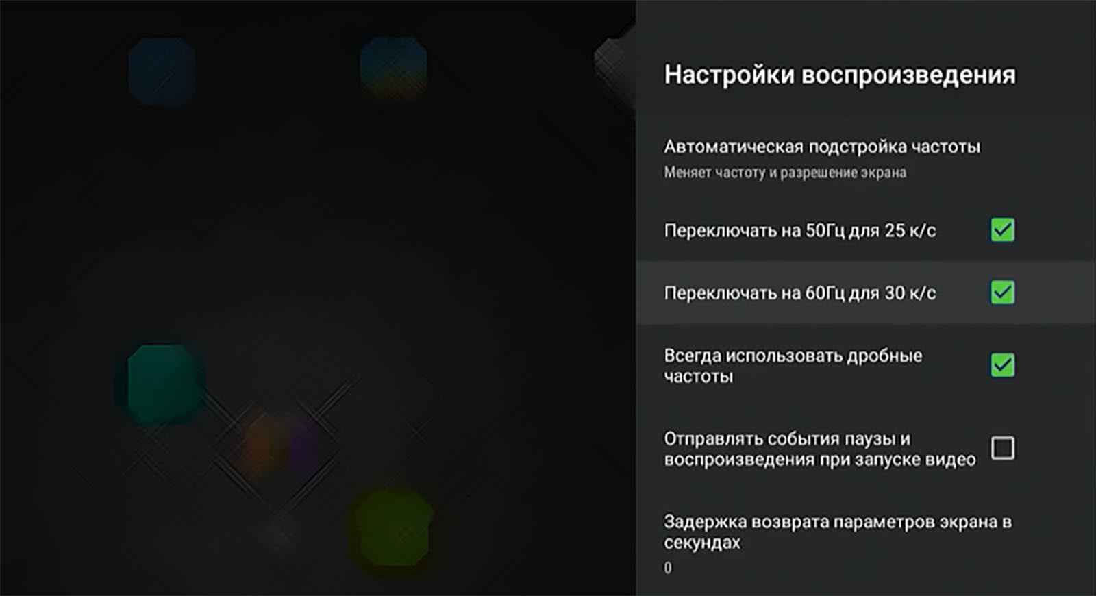 Программный способ требует настройки, но имеет неоспоримые преимущества. Можно включить Auto Frame Rate только в нужных приложениях. Есть возможность задать отсрочку его включения, например, установить 5-секундную задержку, которой хватит для пауз при переключении каналов или перемотке видео. Когда окончательно выберите контент для просмотра, приложение активирует Auto Frame Rate и сменит частоту экрана.