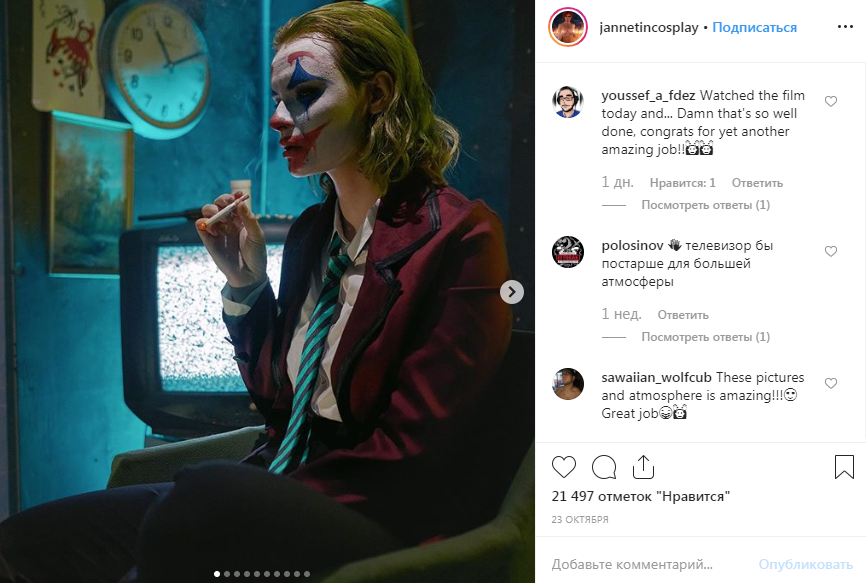 - Одна из свежих фото-сессий – со злодейским негодяем Джокером. Оригинальное решение в «женском» варианте косплеер Жанна Рудакова опубликовала в октябре 2019-го. Во время работы, кстати, возникли сложности: девушка не курит и не переносит табачного дыма, а требовалась для дополнения образа сигарета в руках у Джокера.