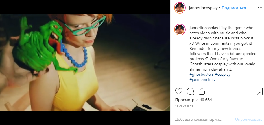 - Жанин Мельнитц, кинокартина «Охотники за привидениями». Интересный факт: для фото-сессии с этой героиней девушка-косплеер заказала вручную изготовленного лизуна, также была использованы на съемках старинная лампа и раритетная печатная машинка.