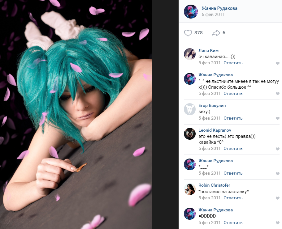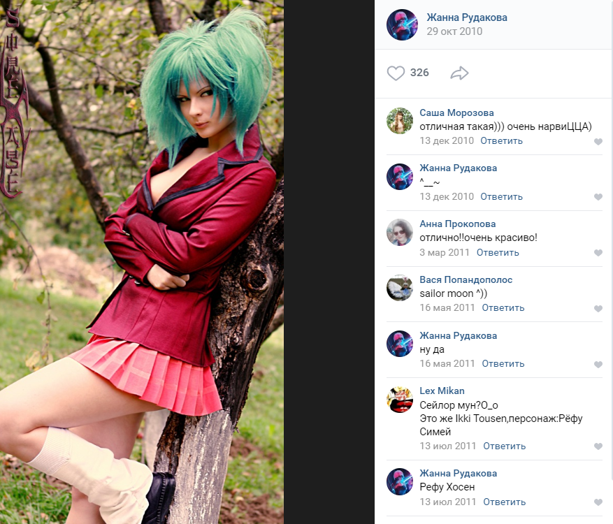 - Первые ее работы датируются 2010-м годом, а сама девушка говорит, что косплеером она стала в шестнадцатилетнем возрасте: почему так мало работ у нее за период до 2014-го? В интернете есть сведения, что Жанна Рудакова активно тогда снималась, но многие ее фото имели слишком эротическое содержание, были несколько раз незаконно слиты в открытую сеть, и по этой причине их пришлось удалить.