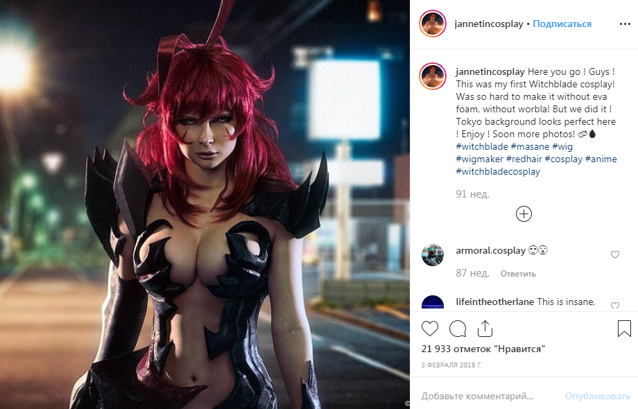 В том же посте девушка делилась, как ей тяжко было добывать первые парики, крафтить костюмы и необходимые предметы антуража. «В России крайне тяжело было доказать, когда моя карьера только начиналась, что косплей – это не дурацкое (или странное) увлечение, а серьезный бизнес. Все, что сейчас мною достигнуто – результат упорного труда, поиска единомышленников. Нужна была нечеловеческой силы мотивация, огромная сила воли», – ее слова. Еще фрагмент текста: «Ценны были каждая встреча, любой комментарий к фотографии, даже негативный. Это было великое удовольствие, когда косплей у нас стал развиваться, появилась поддержка поклонников – не описать словами, насколько это давало ощущение счастья!»