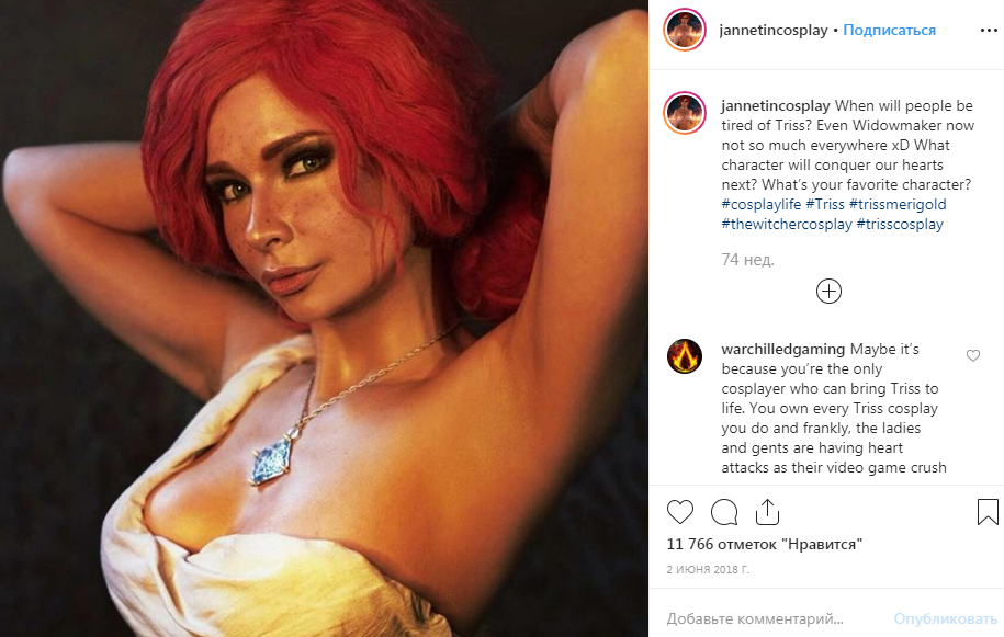 Трисс, подруга Геральта из «Ведьмака». Серия этих изображений, сделанных Жанной Рудаковой, была опубликована в польском издании «Playboy» и произвела настоящий фурор в сети. Почти все косплееры делают упор на «няшность» рыжеволосой красавицы, а в данном случае была умело показана ее соблазнительность.