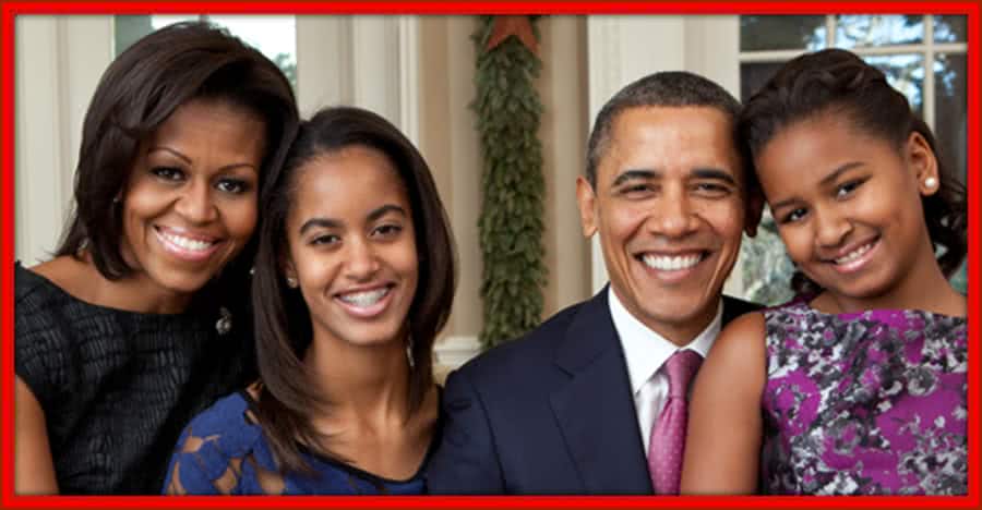 У парочки появились две дочки Малия Энн в 1998 году и Саша в 2001. Экс-президент Америки души не чает в жене, обожает ее за чувство юмора и честность. Как доказательство, Барак всегда одаривает любимую цветами, а она вдохновляет мужа на новые начинания. Всей семьей у первых лиц принято ходить на пикники, играть в теннис или футбол, заниматься плаваньем. Michelle- пример дочерям. Она не пьет и не курит, а также каждое утро в половине пятого отправляется на пробежку длиной 3 километра. Хотя, ходят слухи, что одна из дочерей страдает алкоголизмом и ведет асоциальный образ жизни…